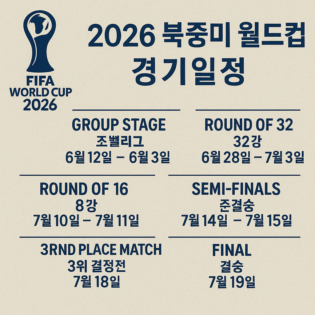 2026 북중미 월드컵의 전체 일정, 조편성 방식, 주요 경기일을 한눈에 확인해보세요. 빠르게 월드컵 일정을 원하시면 아래 버튼에서 확인하세요.